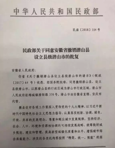 这两天,安庆市潜山县“撤县设市”获批的消息不胫而走。7月14日左右流出的一份民政部函告安徽省人民政府的文件,文件显示:撤销潜山县,设立县级潜山市。相关媒体证实了消息的真实性。潜山县成为“县改市”重启以