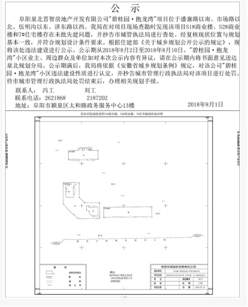 关于对阜阳泉北晋智房地产开发有限公司碧桂园·抱龙湾小区项目违法建设的公示阜阳泉北晋智房地产开发有限公司碧桂园·抱龙湾项目位于潘寨路南侧,市场路北侧,济东路西侧。我局在对项目现场查勘时发现该项目S1#商
