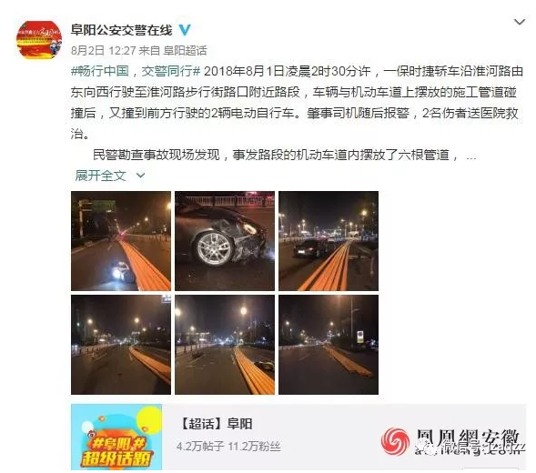 据“阜阳公安交警在线”微博消息称,2018年8月1日凌晨2时30分许,一保时捷轿车沿淮河路由东向西行驶至淮河路步行街路口附近路段,车辆与机动车道上摆放的施工管